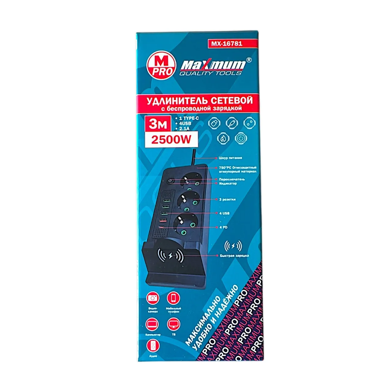 Сетевой фильтр с беспроводной зарядкой на 3 метра от "Maximum Quality Tools" оборудован тремя розетками евро типа с заземлением, а также 4 USB портами и входом Type C. Устройство имеет входное напряжение 220 В и номинальный ток 16 А, что обеспечивает безопасную работу всех подключенных устройств.