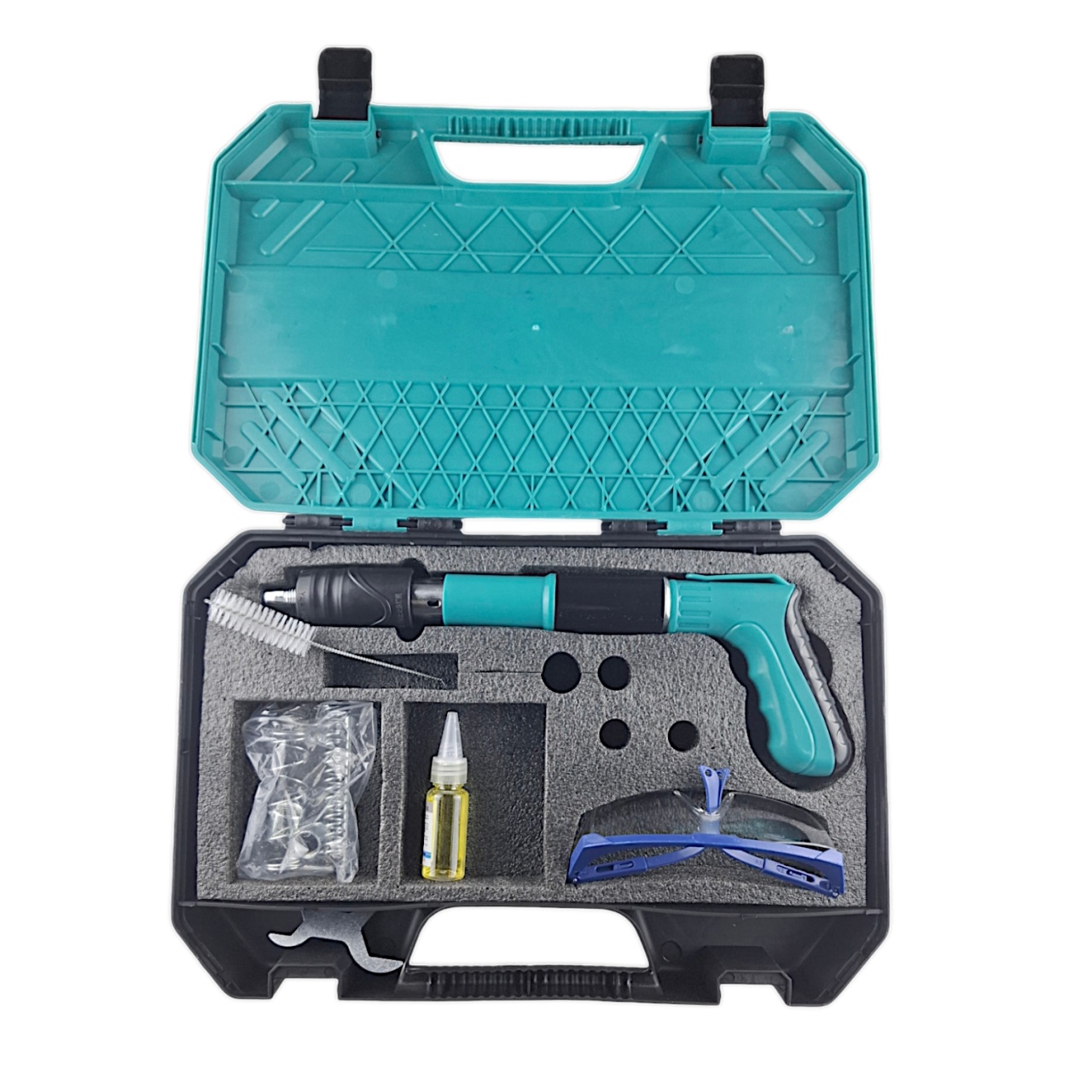 Мощный гвоздезабивной мини-пневмопистолет для дюбель гвоздей изготовлен из высококачественного пластика и металла, и имеет 5 ступеней регулировки мощности.