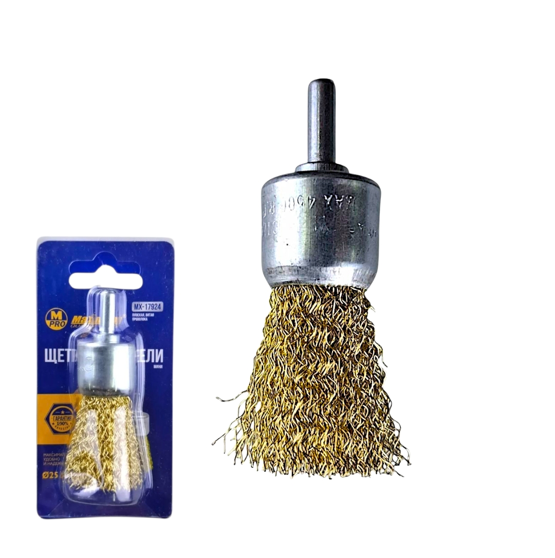 Это чашечная щетка с проволочной щетиной из латуни 25 мм от "MAXIMUMQUALITYTOOL". Латунированная щетка крепится на дрель или шуруповерт через резьбовую шпильку и предназначена для более специфичных задач, чем нейлоновая.